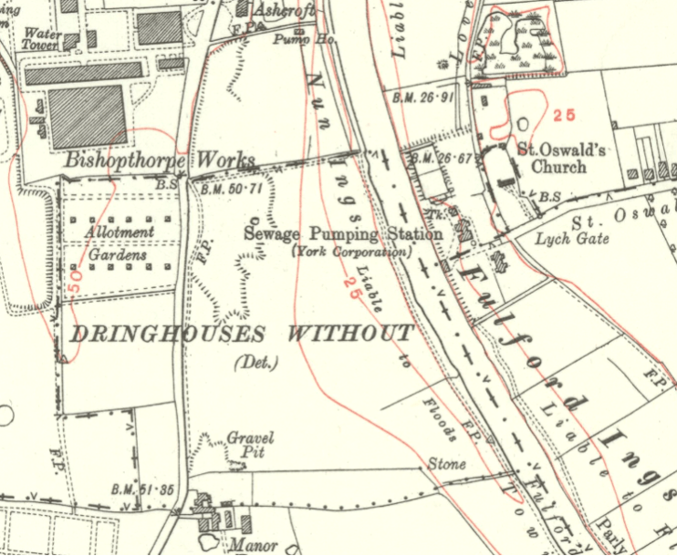 Close to York the nunnery owned land at Middlethorpe which was rented out to the people of York, and which included land bordering the river and running towards the city, and now known as ‘Nun Ings’. Today it is regarded as starting at what is now Manor Farm and finishing opposite the old Terry’s chocolate factory site, with Bishopthorpe Road providing the boundary on the west side. The road runs along the top of a gravel ridge running southwards out of York, placing the Ings on two levels – a raised plateau next to the road and a lower, flat zone of meadow land near the river, with a sloping bank in between.